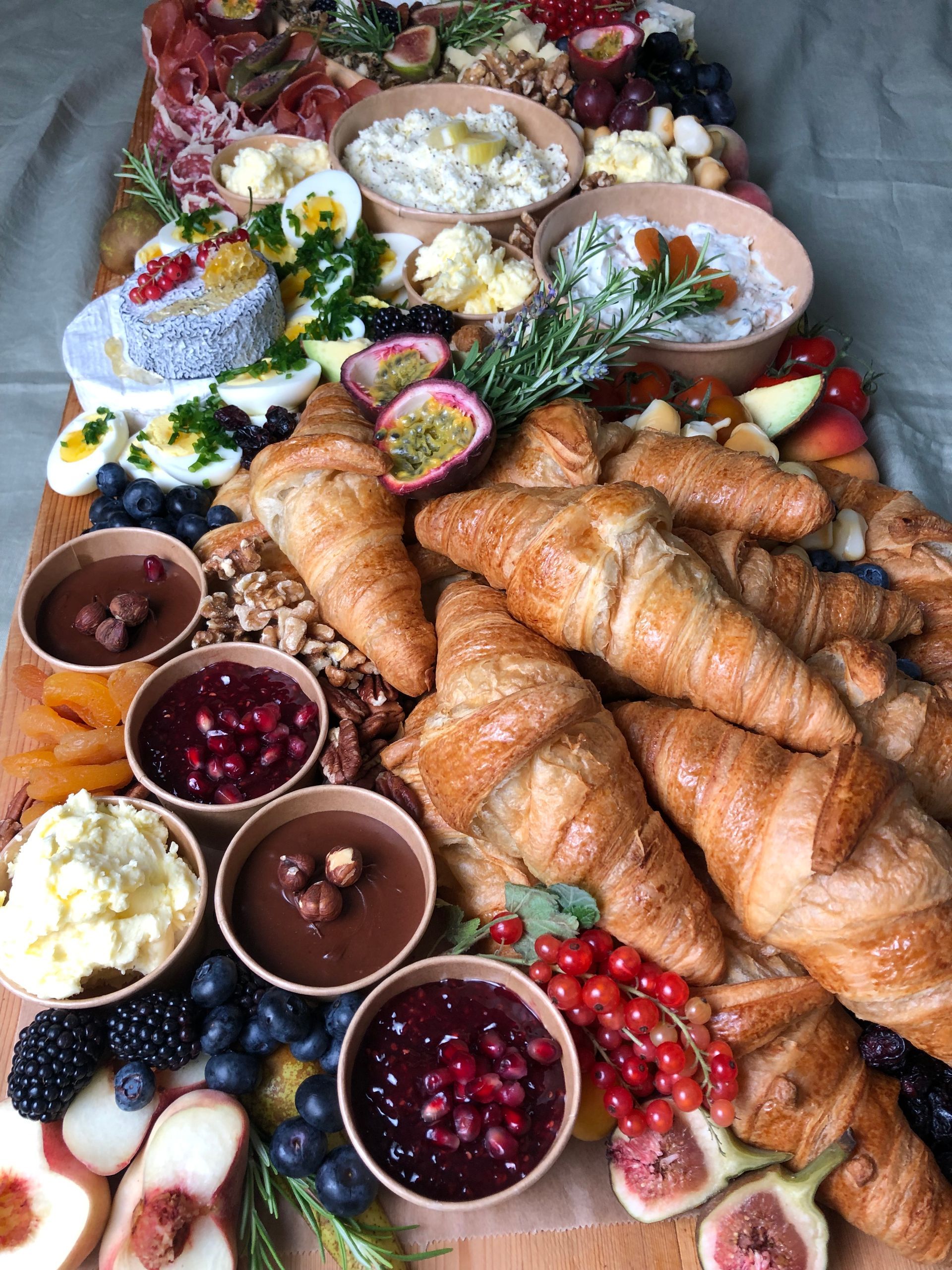 - Charcuterie, Weich & Hartkäse, Nüsse, Obst der Saison, Oliven, Kräuter, selbstgemachte Dips, süße Aufstriche, Ei, Butter, Avocado, No bake Cheesecake, Joghurt mit selbstgemachtem Granola, Croissants